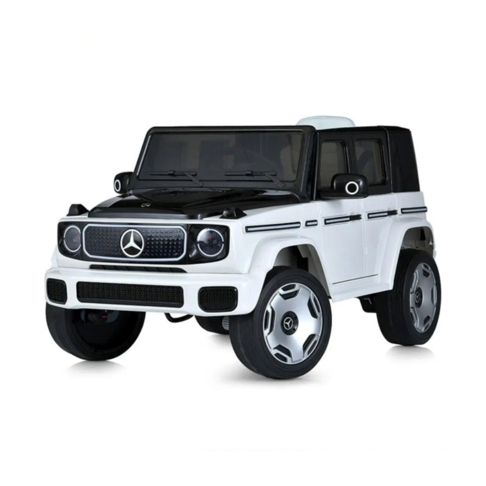 De Mercedes-Benz EQG is voorzien van heldere LED-verlichting aan de voor- en achterkant, op het dashboard en langs de carrosserie, waardoor de auto ook in het donker goed zichtbaar is. Voor een extra levensechte beleving beschikt het voertuig over authentieke motorgeluiden, een toeter en een geïntegreerde muziekmodule met MP3-, USB- en Bluetooth-ondersteuning. Dankzij het instelbare volume en de digitale batterij-indicator blijft het rijplezier altijd onder controle.