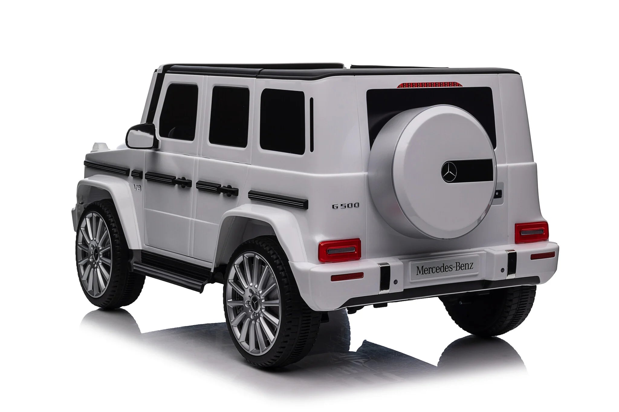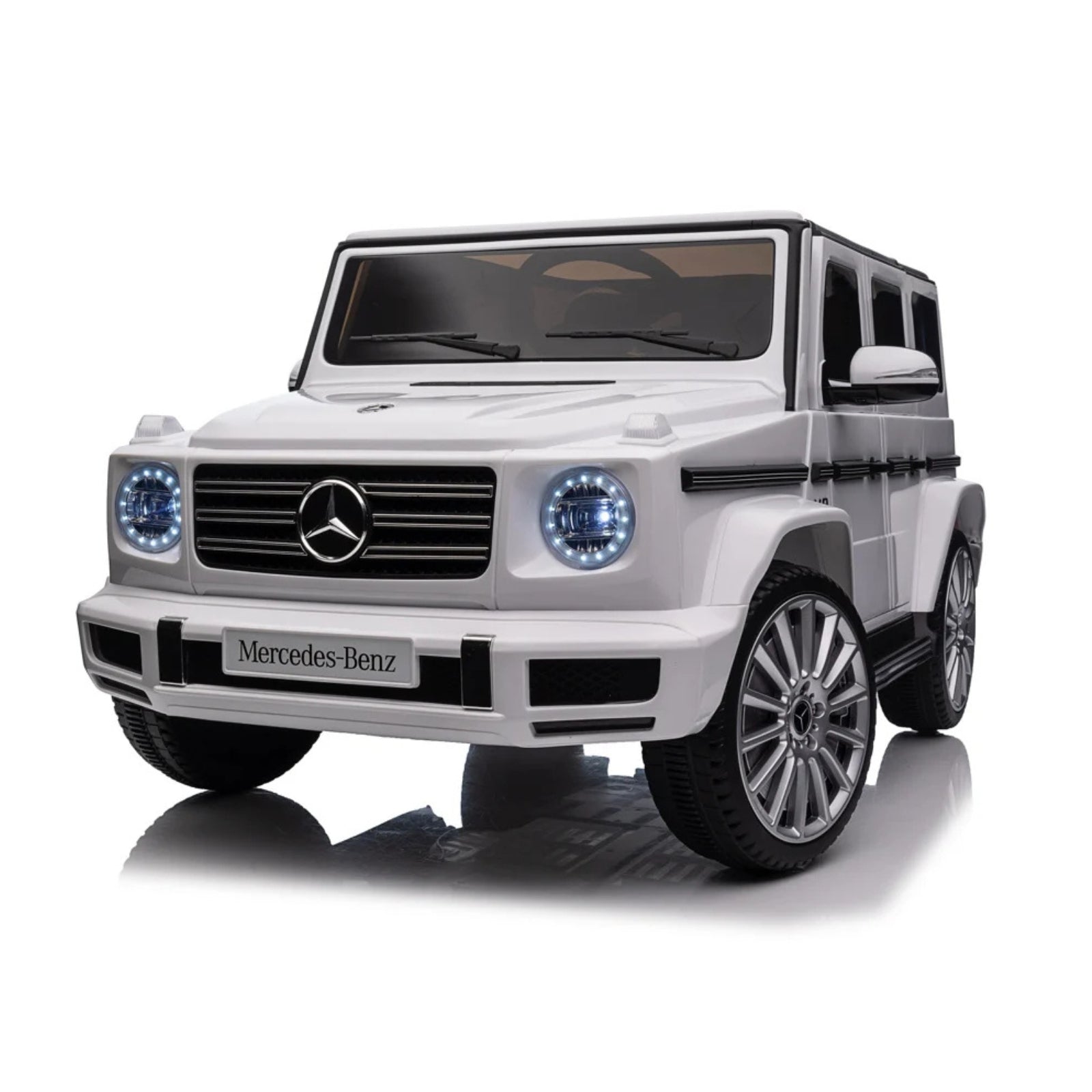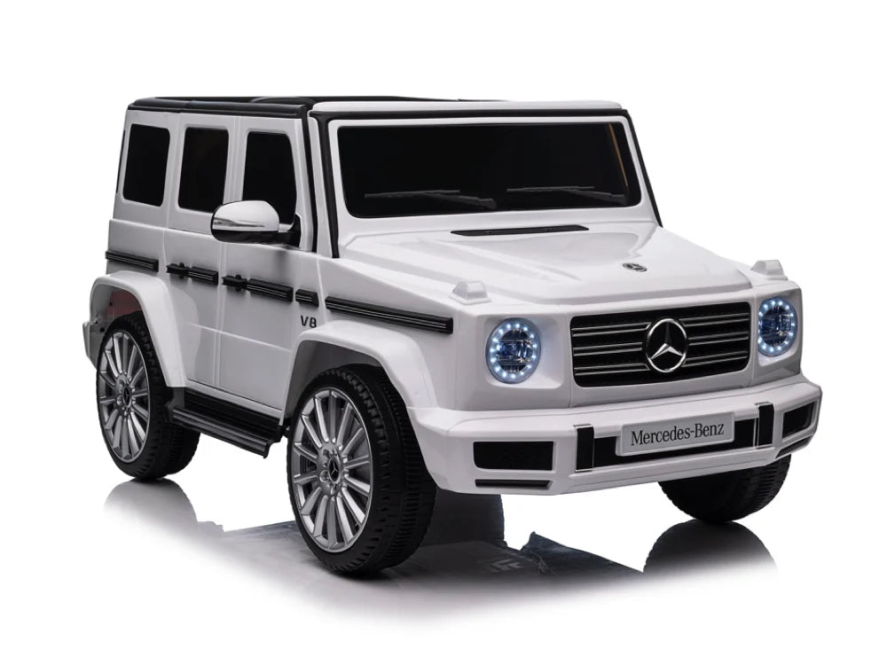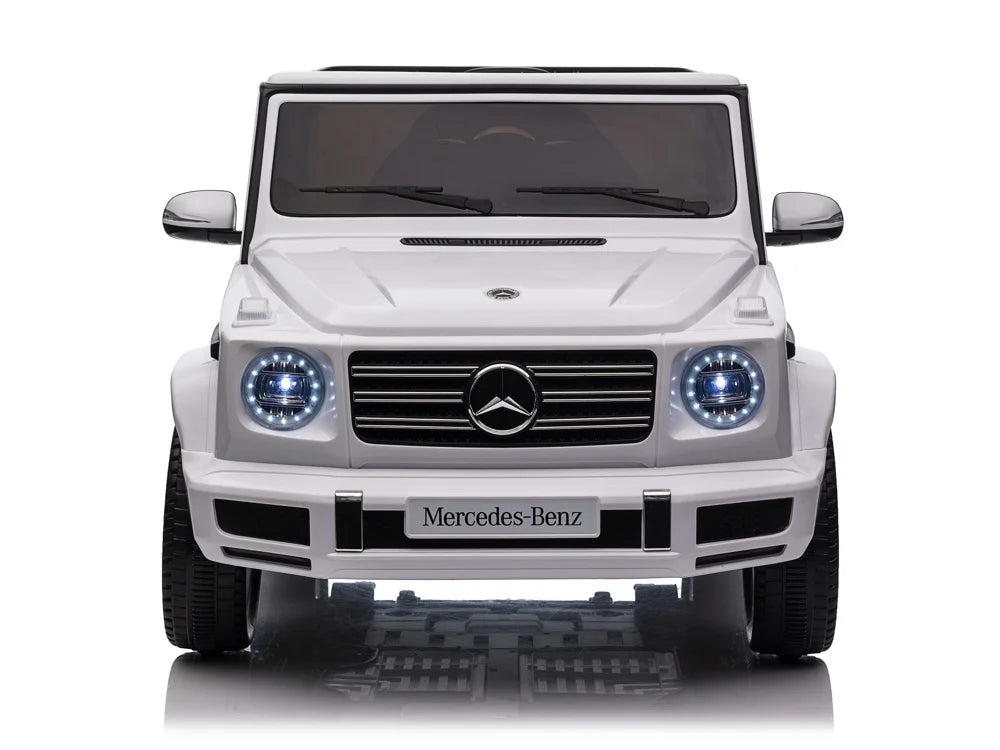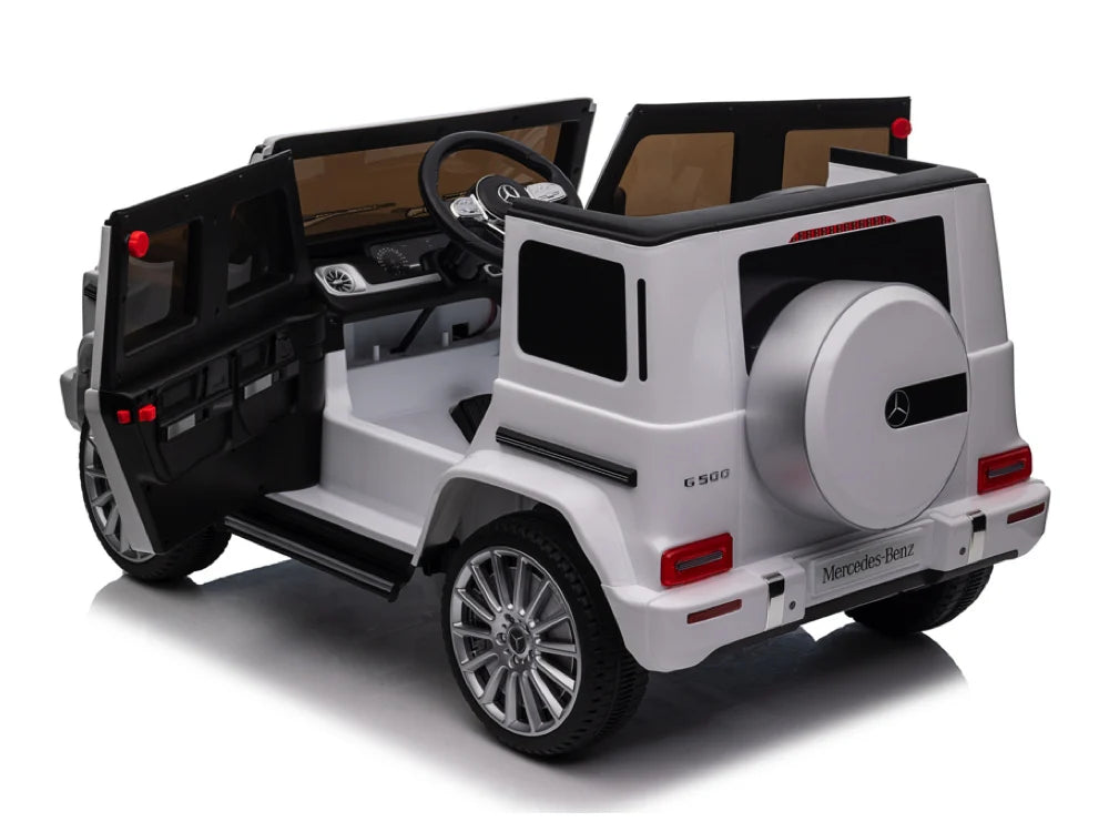 De Mercedes G500 is uitgerust met LED-verlichting in de koplampen, waardoor de auto er niet alleen realistisch uitziet, maar ook goed zichtbaar is. Het luxe kunstlederen zitje met veiligheidsgordel biedt een comfortabele en veilige rijervaring, terwijl de geveerde achterwielen schokken opvangen voor een soepele rit, zelfs op ruigere ondergronden.