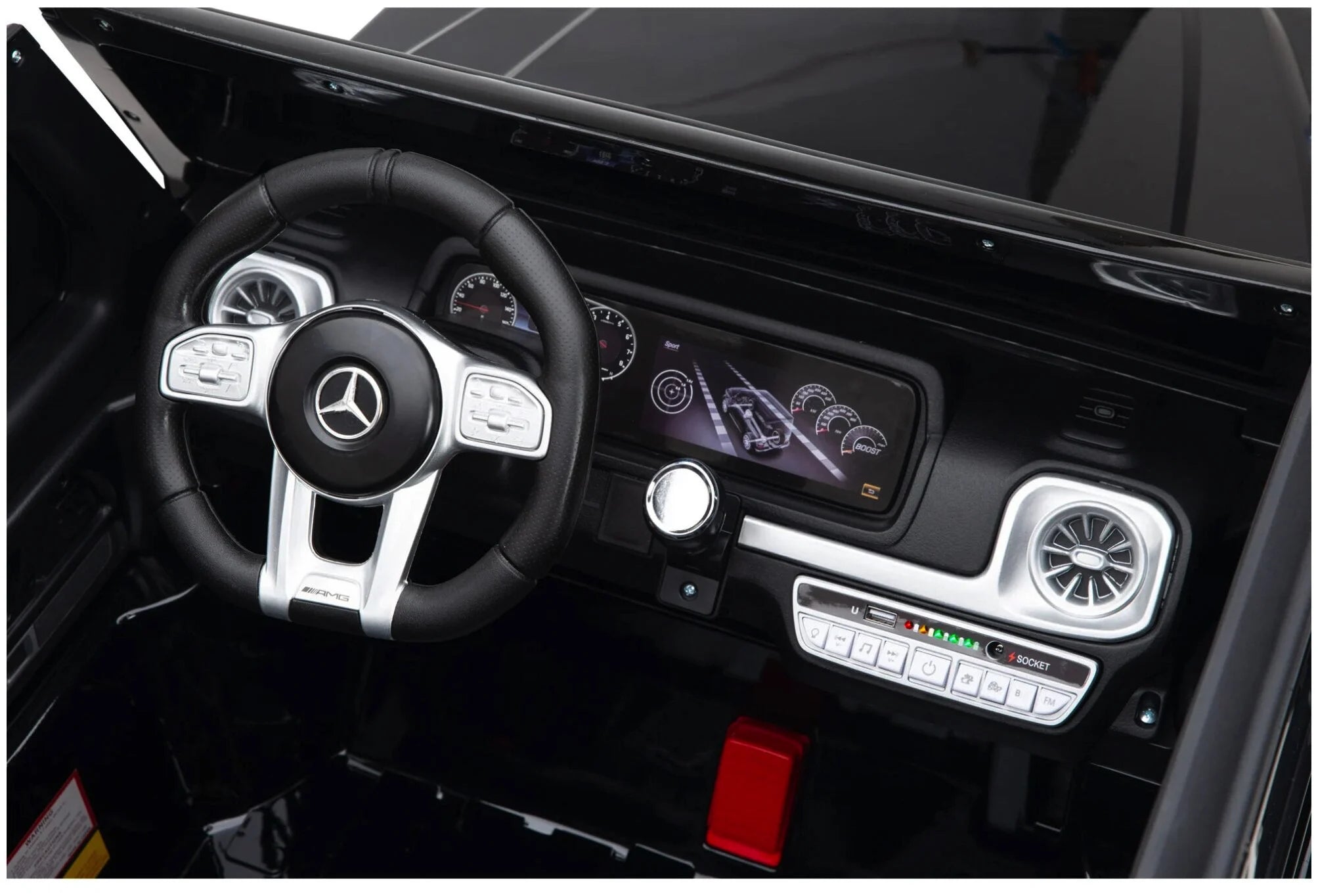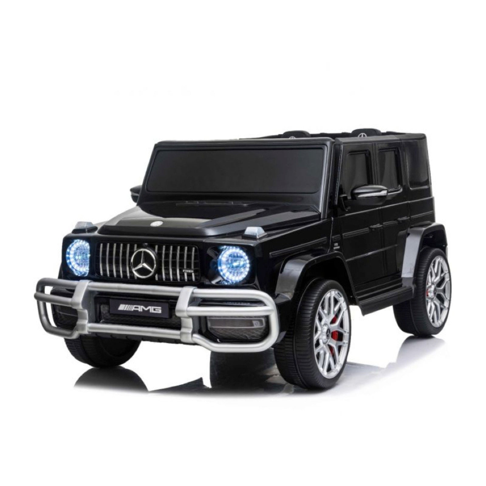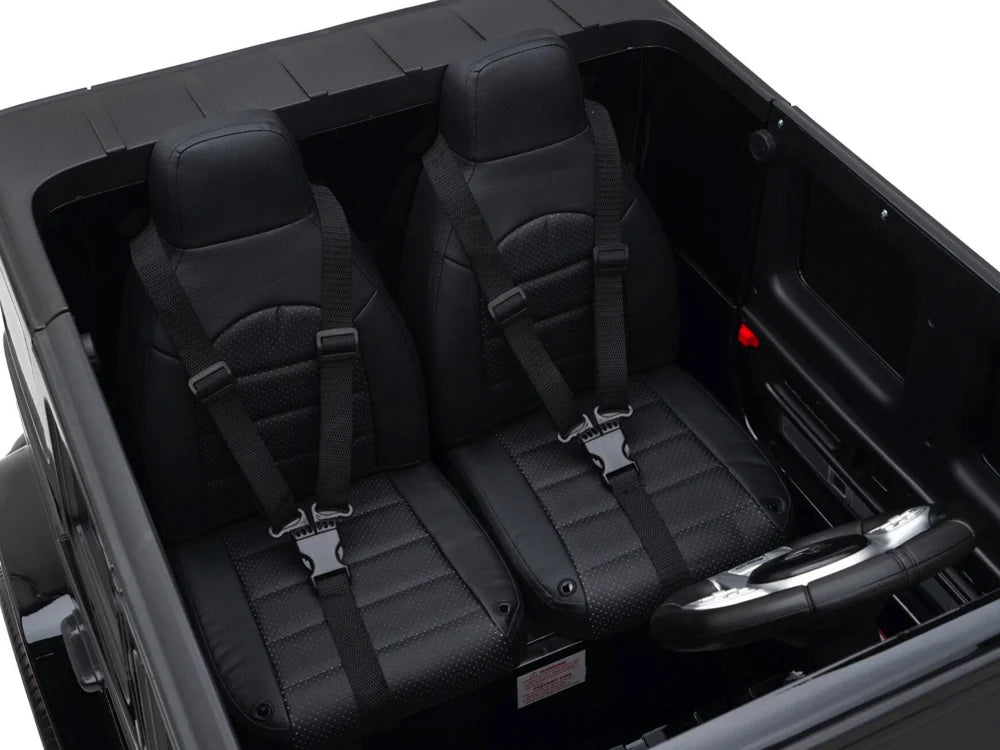 Deze Mercedes G63 is voorzien van twee echte deuren, een luxe kunstlederen zitje en een ruime tweepersoons zitting, waardoor kinderen samen kunnen genieten van het avontuur. De ingebouwde LED-verlichting in de koplampen, achterlichten en het dashboard zorgt voor een indrukwekkend effect, zowel overdag als in het donker.