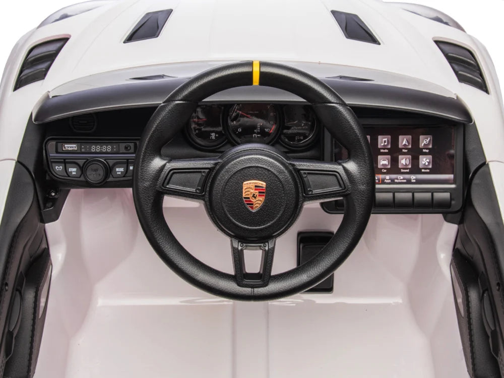 Dankzij de vering op alle vier de wielen rijdt de Porsche Spyder RS soepel, zelfs op minder vlakke ondergronden. Het luxe kunstlederen zitje met veiligheidsgordel zorgt voor extra comfort en veiligheid, zodat jonge bestuurders zich volledig kunnen concentreren op hun avontuur.
